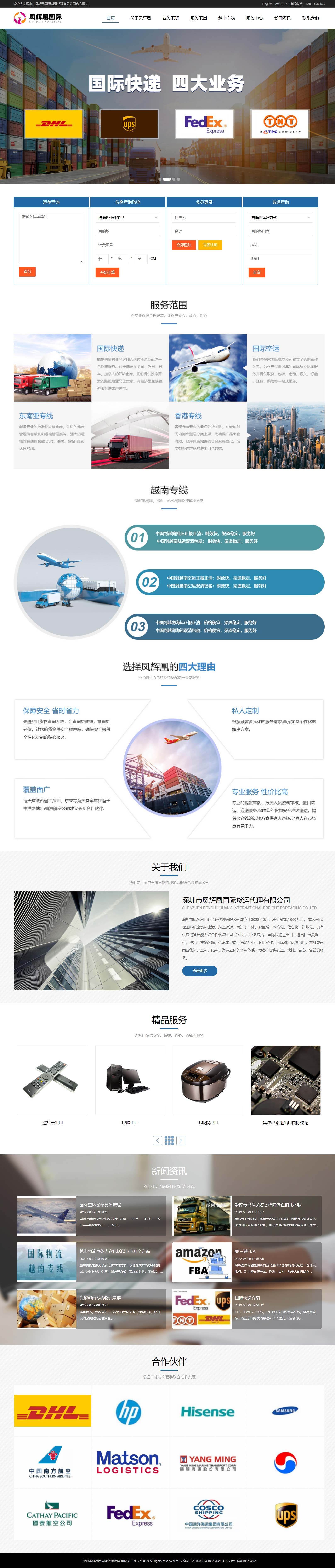 深圳市鳳輝凰國(guó)際貨運(yùn)代理有限公司采用我司標(biāo)準(zhǔn)版的三合一網(wǎng)站風(fēng)格,采用藍(lán)色風(fēng)格色調(diào)為主的進(jìn)行頁(yè)面展示。